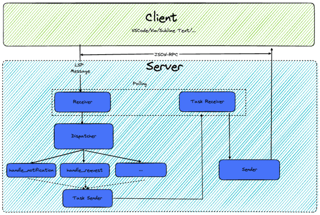 Notification(open/close/change/delete files, etc.) andRequest(goto definition, hover, etc.), as well as messages from the server itself the Task. And uniformly encapsulated into an event (Event) and handed over to the next step for processing. - For different events, follow the steps below: